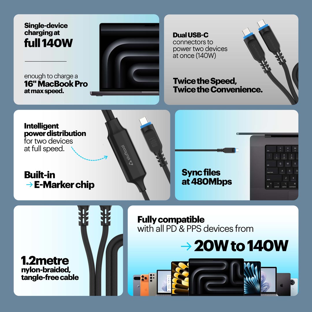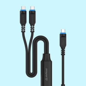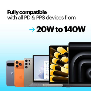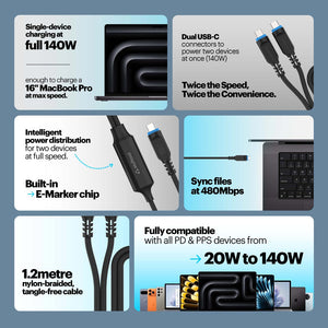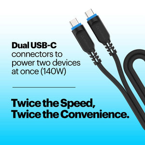 The Duplo 140W Dual Type-C Cable is built to do the work of two, so you never have to carry extra cables again. With dual USB-C connectors and a smart E-Marker chip, it intelligently distributes power between your devices — charge a MacBook and an iPhone together, charge two laptops side by side, or top up your iPhone and AirPods at once without slowing down. When used with a single device, it delivers up to 140W PD 3.1 fast charging (28V/5A), making it powerful enough to handle even a 16" MacBook Pro at full speed.