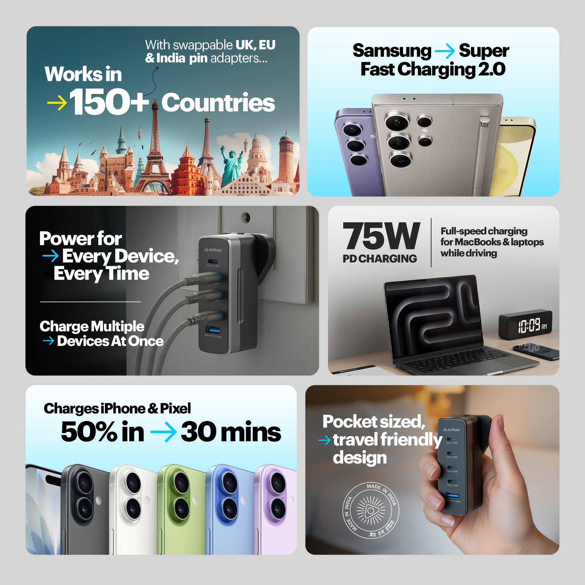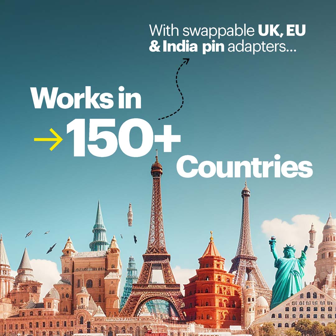 Empire is built for Globetrotters. It's in-built US plug with swappable UK, EU, and India plugs works seamlessly in 150+ countries. Its anti-rust pins and shockproof housing ensure reliable performance, wherever your journey takes you. Compact enough to slip into your pocket or travel bag, Empire is your perfect travel companion.